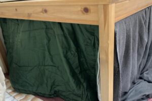 緑のこたつ布団はキャプテンスタッグの寝袋、グレーの布は大判ストールを再利用。